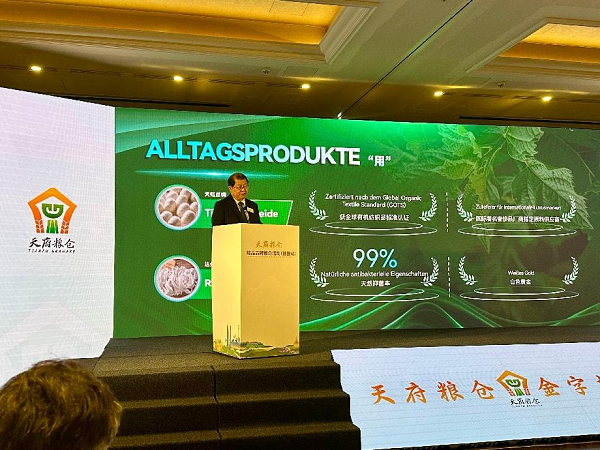 当地时间6月16日,由四川省农业农村厅主办的“天府粮仓”精品品牌推介活动(德国站)在法兰克福成功举办。来自四川的16家农业企业的特色农产品亮相,德国农业贸易、餐饮等相关行业企业代表参加活动。本次活动是“天府粮仓”精品品牌推介活动“出海”办会的又一次精彩呈现。四川省农业农村厅厅长蒋刚,中德农业中心主任于尔根·里特、中国贸促会驻德国代表处首席代表房芳出席活动并致辞。作为绵阳市代表企业,绵阳天虹丝绸有限责任公司携特色茧丝产品及非遗蜀绣产品精彩亮相,让“川字号”精品闪耀莱茵河畔,“绵阳制造”走进法兰克福。四川省农业农村厅厅长蒋刚在活动致辞及推介中,特别介绍了天虹丝绸的品牌成就。